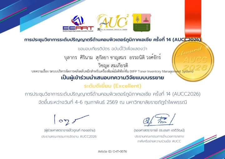 - ผลงานเรื่อง: ระบบบริหารจัดการคลังตลับหมึกสำหรับเครื่องพิมพ์มัลติฟังก์ชัน (MFP Toner Inventory Management System)