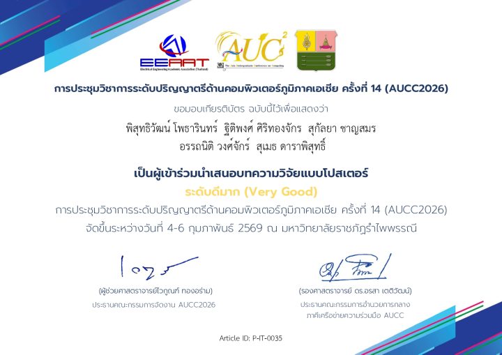 คณาจารย์และนักศึกษาสาขาวิชาเทคโนโลยีสารสนเทศและการสื่อสาร (ICT) คณะวิทยาศาสตร์และเทคโนโลยี มหาวิทยาลัยเทคโนโลยีราชมงคลตะวันออก ประสบความสำเร็จและสร้างชื่อเสียงให้กับมหาวิทยาลัยอีกครั้ง โดยสามารถคว้ารางวัลจากการนำเสนอผลงานวิจัยได้ครบทั้ง 3 ผลงาน ในการประชุมวิชาการระดับปริญญาตรีด้านคอมพิวเตอร์ภูมิภาคเอเชีย ครั้งที่ 14 (The 14th Asia Undergraduate Conference on Computing: AUCC 2026) ซึ่งจัดขึ้นระหว่างวันที่ 4 – 6 กุมภาพันธ์ 2569 ณ มหาวิทยาลัยราชภัฏรำไพพรรณี จังหวัดจันทบุรี
