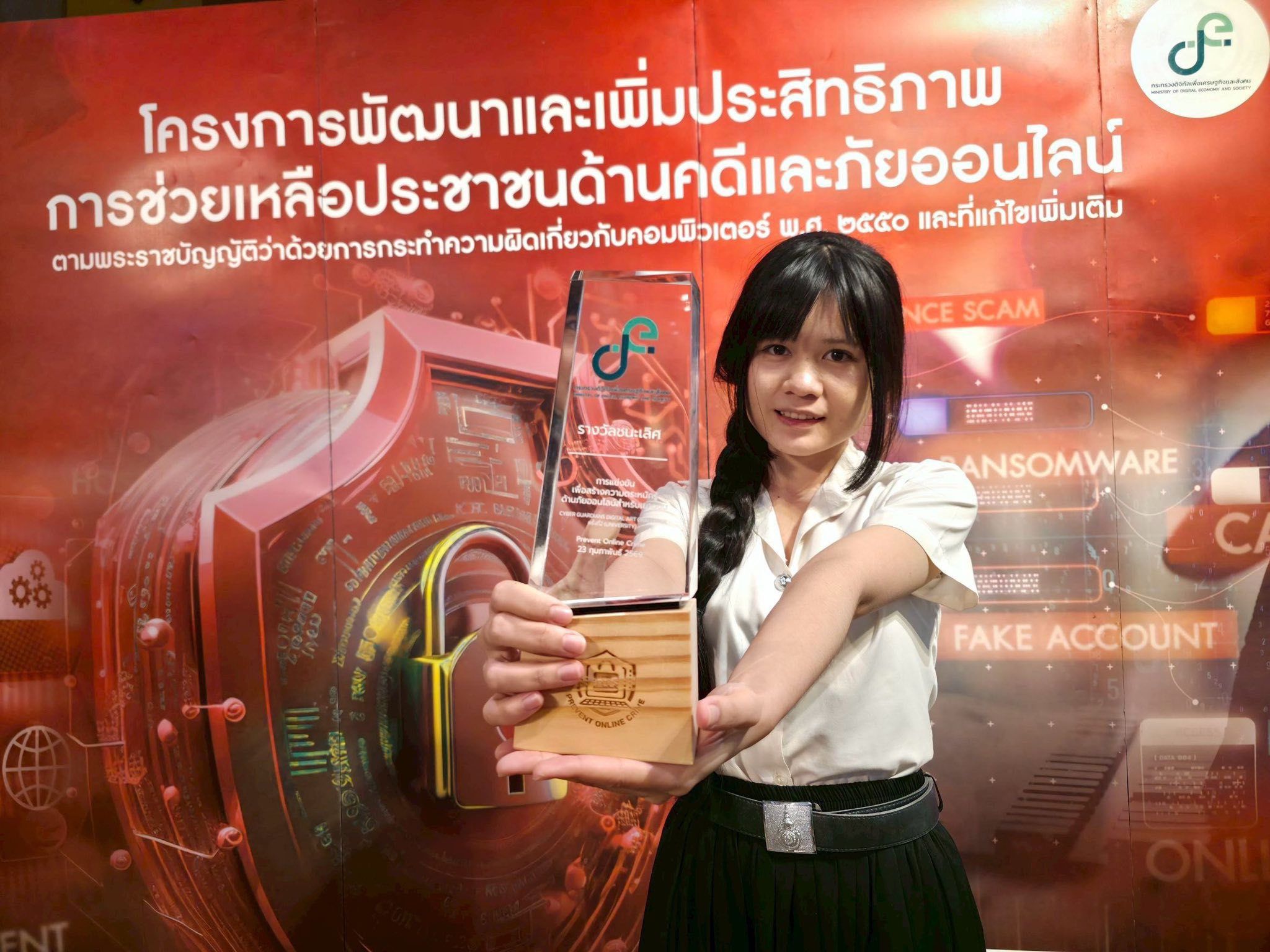 ผลงานที่ได้รับรางวัลชนะเลิศ คือ คลิปวิดีโอสร้างสรรค์เพื่อรณรงค์สร้างความตระหนักรู้ด้านภัยคุกคามทางไซเบอร์ ซึ่งมีความโดดเด่นในการประยุกต์ใช้เทคโนโลยีปัญญาประดิษฐ์ (AI) ในการสร้างสรรค์ผลงานได้อย่างมีประสิทธิภาพและน่าสนใจ จนสามารถชนะใจคณะกรรมการและผู้เข้าแข่งขันจากทั่วประเทศ ได้รับเงินรางวัลมูลค่า 50,000 บาท พร้อมโล่รางวัลและเกียรติบัตร