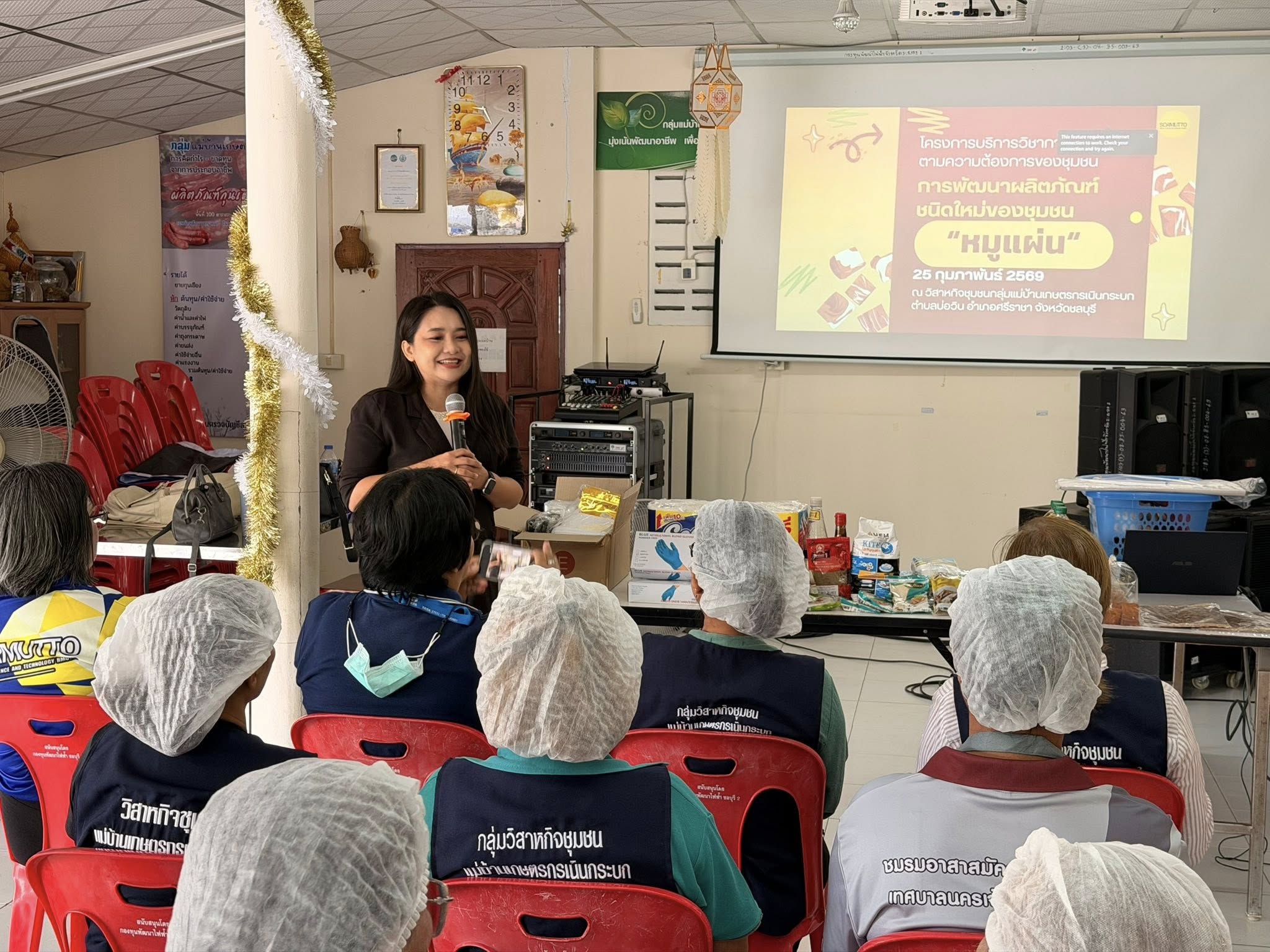 วันที่ 25 กุมภาพันธ์ 2569 – คณะวิทยาศาสตร์และเทคโนโลยี จัดโครงการบริการวิชาการตามความต้องการของชุมชน ภายใต้กิจกรรมที่ 1 การพัฒนาผลิตภัณฑ์ชนิดใหม่ของสินค้าชุมชน ให้แก่กลุ่มวิสาหกิจชุมชนแม่บ้านเกษตรกรเนินกระบก โดยมีวัตถุประสงค์เพื่อถ่ายทอดองค์ความรู้และเทคโนโลยีในการแปรรูปผลิตภัณฑ์ เพื่อสร้างมูลค่าเพิ่มและส่งเสริมศักยภาพในการแข่งขันให้กับสินค้าของชุมชน