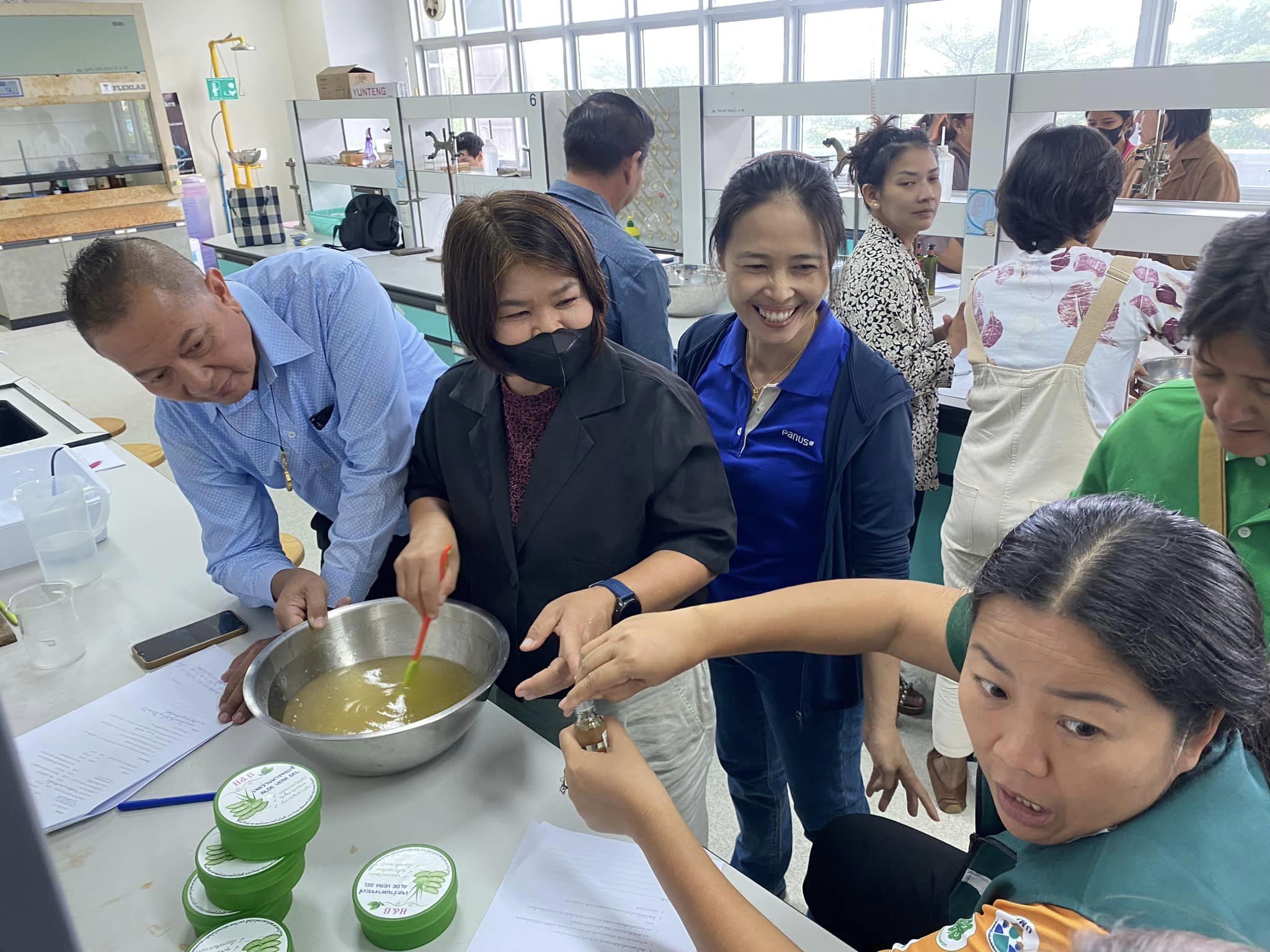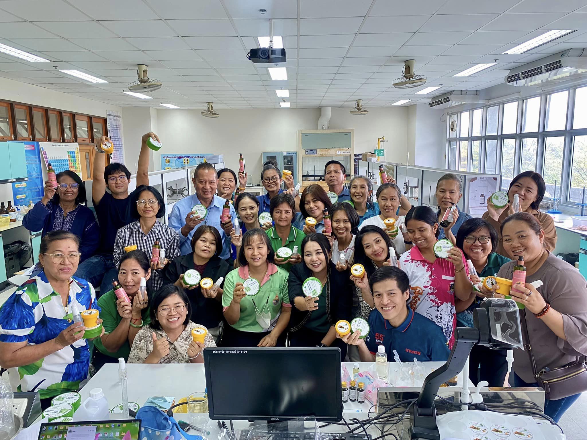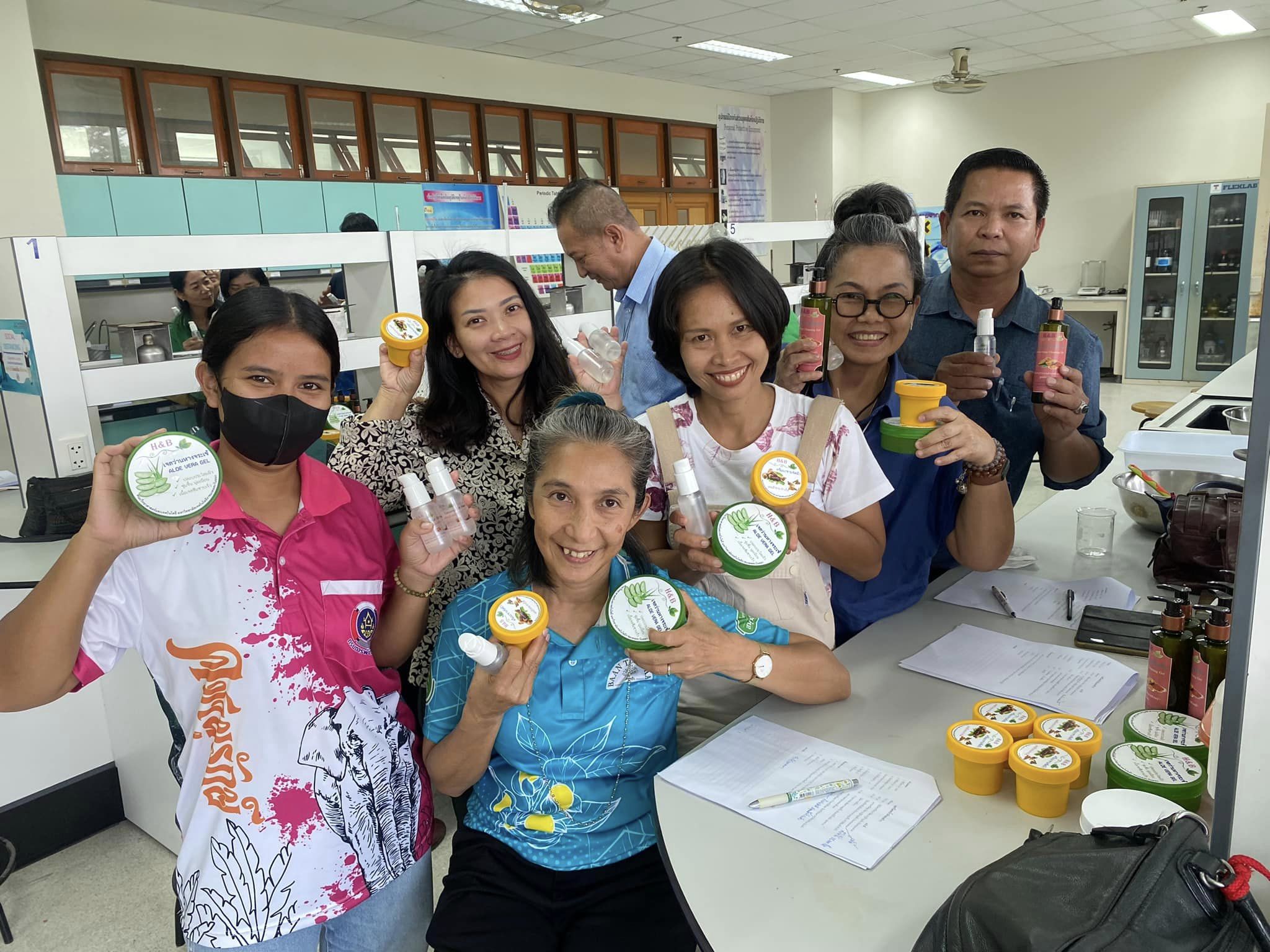 โดยมี ผศ.ดร.อรพรรณ ใจสมุทร และ ผศ.ดร.กรณัฏฐ์ นาคภิบาล อาจารย์ประจำหลักสูตรผลิตภัณฑ์เพื่อสุขภาพและความงาม คณะวิทยาศาสตร์และเทคโนโลยี เป็นวิทยากรบรรยายในหัวข้อเรื่อง กระบวนการผลิต และการแปรรูปผลิตภัณฑ์ความงามจากวัตถุดิบของชุมชน การพัฒนาผลิตภัณฑ์ใหม่จากวัตถุดิบของชุมชนเพื่อส่งเสริมธุรกิจ และการส่งออกสินค้า และปฏิบัติการ เรื่อง การทำแฮร์โคทน้ำมันมะพร้าว การทำอโลเวลล่าเจลบำรุงผิว เจลล้างหน้าขมิ้นชันสูตรอ่อนโยน และครีมมะขามขัดผิว