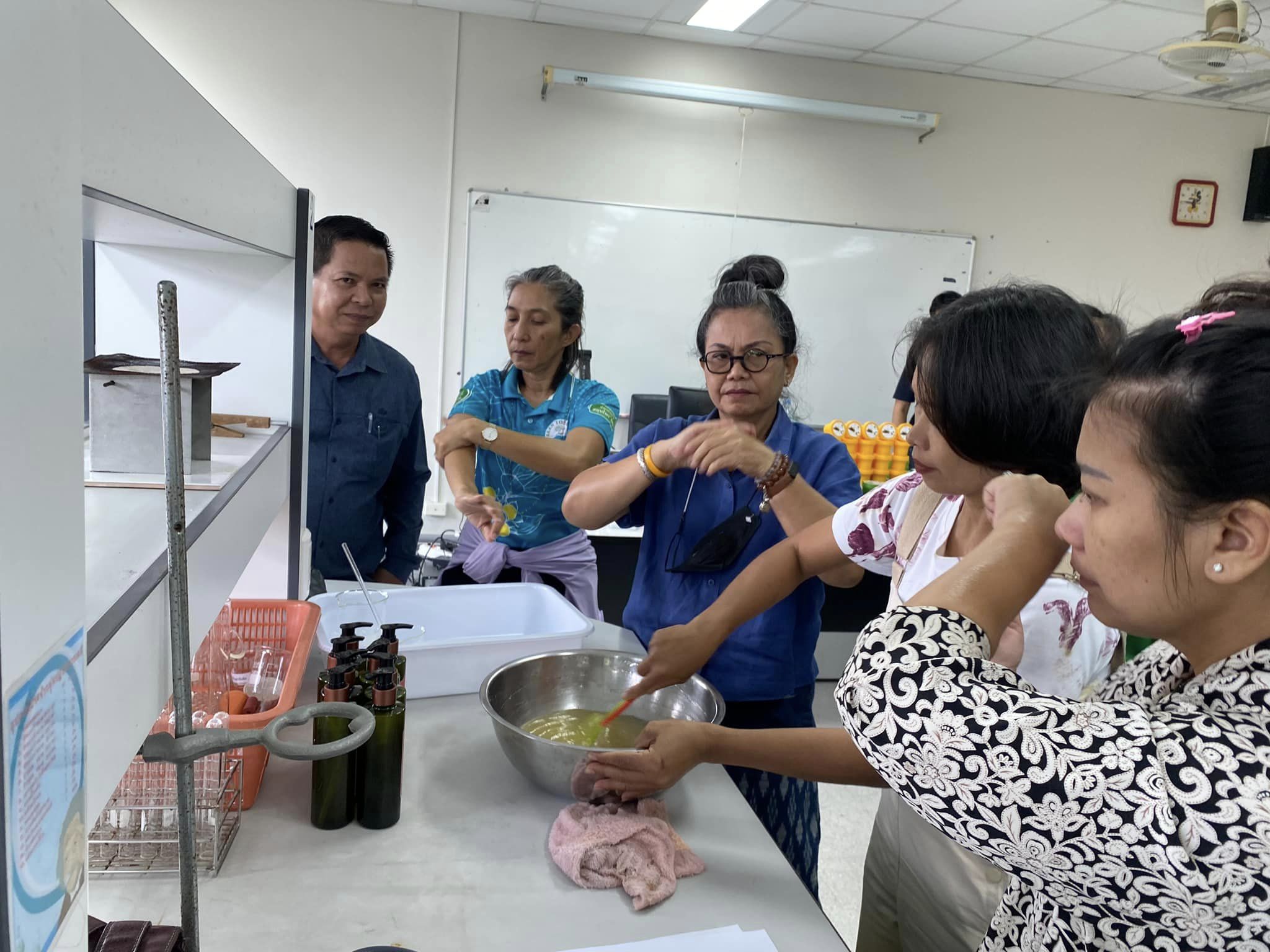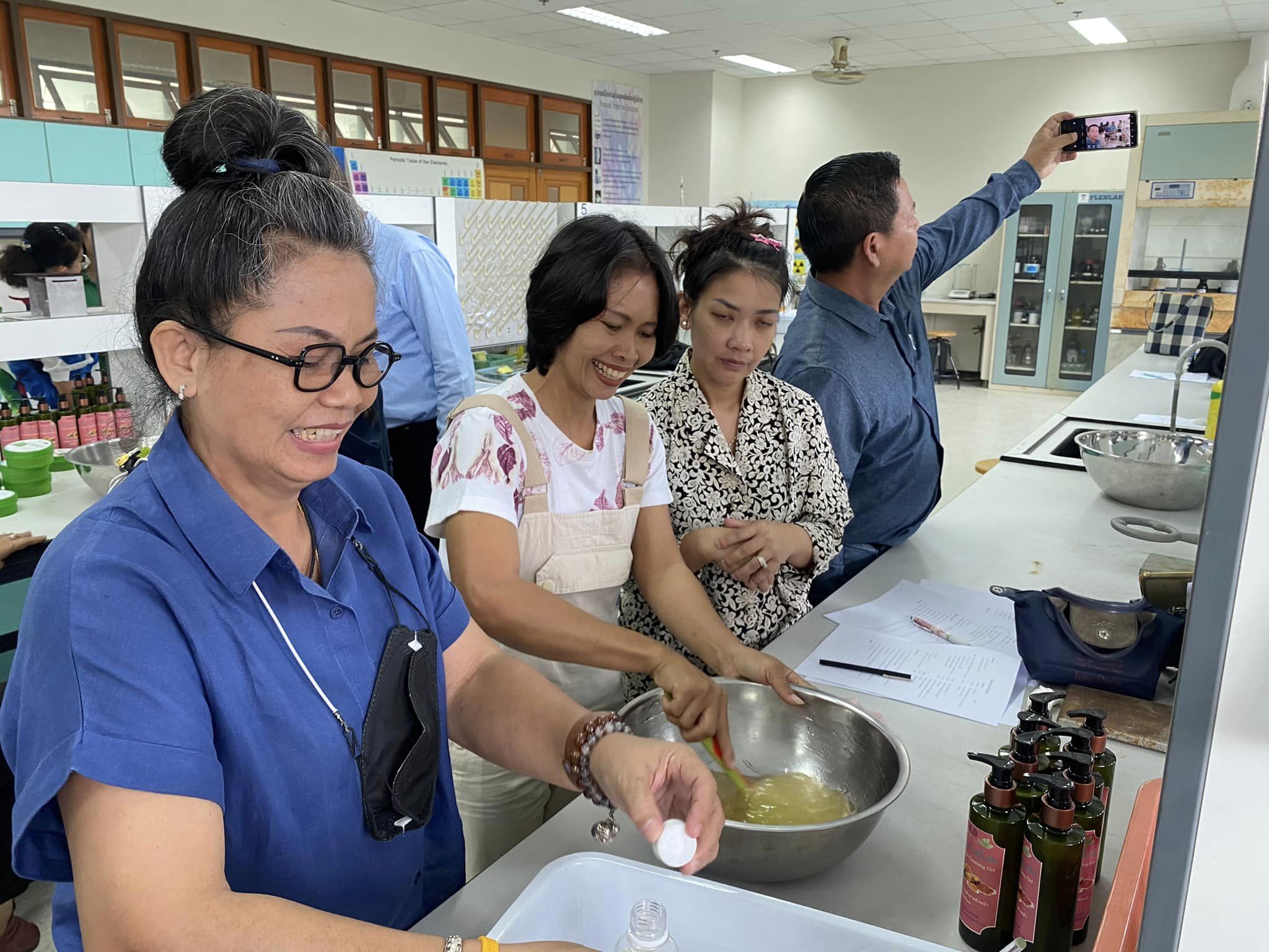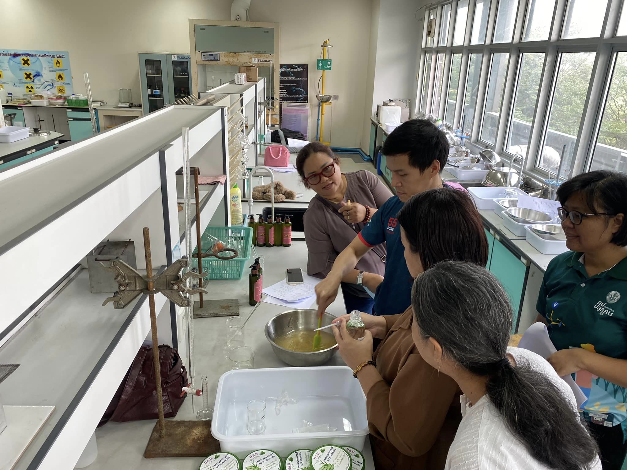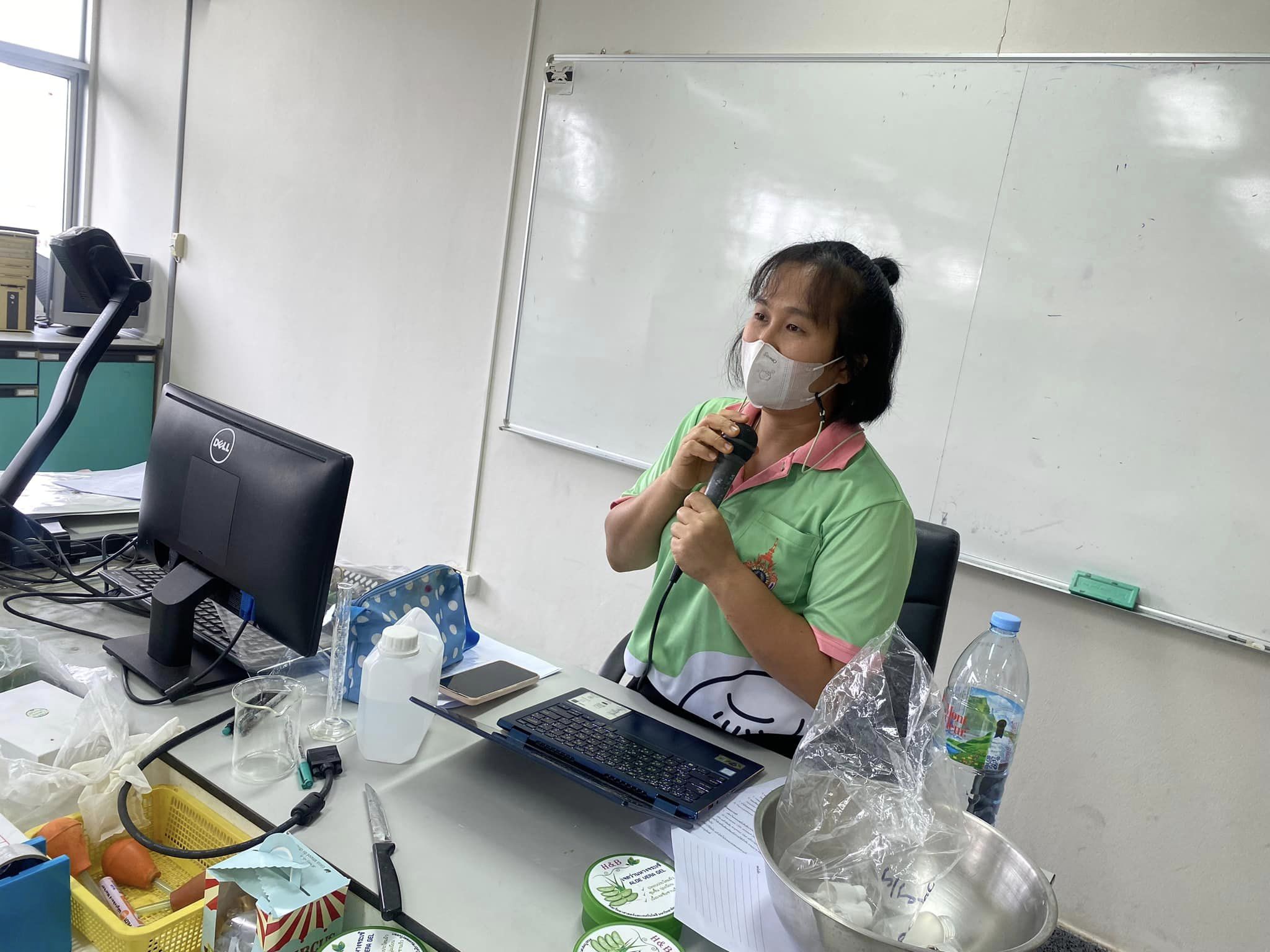 โดยมี ผศ.ดร.อรพรรณ ใจสมุทร และ ผศ.ดร.กรณัฏฐ์ นาคภิบาล อาจารย์ประจำหลักสูตรผลิตภัณฑ์เพื่อสุขภาพและความงาม คณะวิทยาศาสตร์และเทคโนโลยี เป็นวิทยากรบรรยายในหัวข้อเรื่อง กระบวนการผลิต และการแปรรูปผลิตภัณฑ์ความงามจากวัตถุดิบของชุมชน การพัฒนาผลิตภัณฑ์ใหม่จากวัตถุดิบของชุมชนเพื่อส่งเสริมธุรกิจ และการส่งออกสินค้า และปฏิบัติการ เรื่อง การทำแฮร์โคทน้ำมันมะพร้าว การทำอโลเวลล่าเจลบำรุงผิว เจลล้างหน้าขมิ้นชันสูตรอ่อนโยน และครีมมะขามขัดผิว