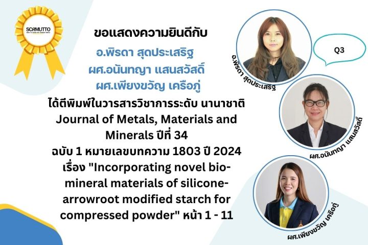 เรื่อง “Incorporating novel bio-mineral materials of silicone-arrowroot modified starch for compressed powder” ตีพิมพ์ในวารสารวิชาการระดับ นานาชาติ Journal of Metals, Materials and Minerals ปีที่ 34