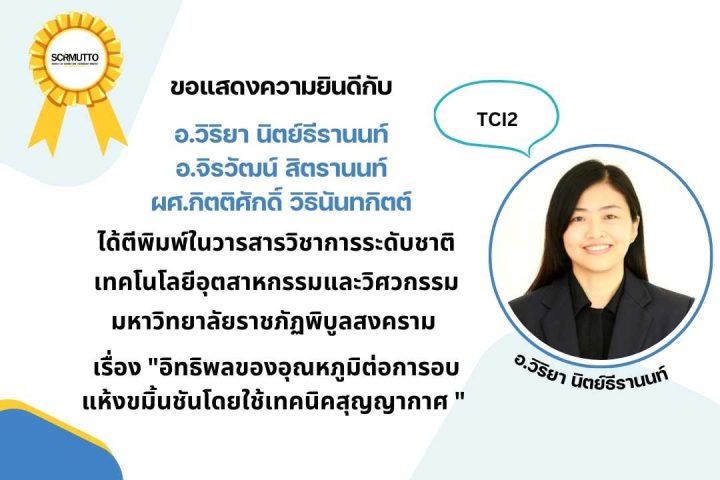 เรื่อง “อิทธิพลของอุณหภูมิต่อการอบแห้งขมิ้นชันโดยใช้เทคนิคสุญญากาศ ” ได้ตีพิมพ์ในวารสารวิชาการระดับชาติ เทคโนโลยีอุตสาหกรรมและวิศวกรรม มหาวิทยาลัยราชภัฏพิบูลสงคราม