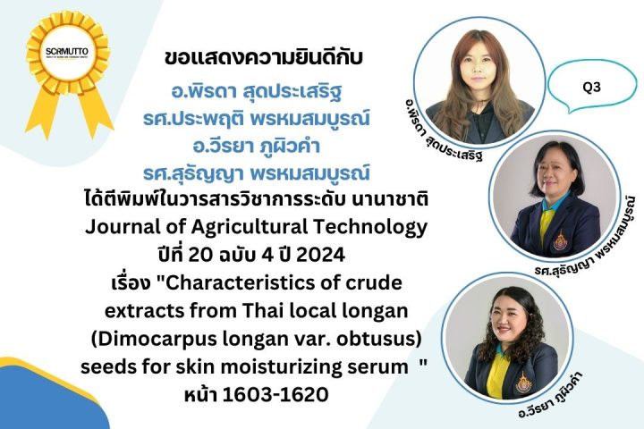 เรื่อง “Characteristics of crude extracts from Thai local longan (Dimocarpus longan var. obtusus) seeds for skin moisturizing serum ” ได้ตีพิมพ์ในวารสารวิชาการระดับ นานาชาติ Journal of Agricultural Technology ปีที่ 20 ฉบับ 4 ปี 2024