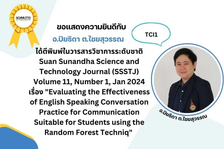 “Evaluating the Effectiveness of English Speaking Conversation Practice for Communication Suitable for Students using the Random Forest Techniq” ได้ตีพิมพ์ในวารสารวิชาการระดับชาติ Suan Sunandha Science and Technology Journal (SSSTJ) Volume 11, Number 1, Jan 2024