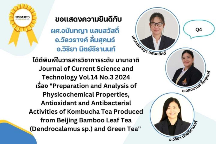 เรื่อง “Preparation and Analysis of Physicochemical Properties, Antioxidant and Antibacterial Activities of Kombucha Tea Produced from Beijing Bamboo Leaf Tea (Dendrocalamus sp.) and Green Tea” ได้ตีพิมพ์ในวารสารวิชาการระดับ นานาชาติ Journal of Current Science and Technology Vol.14 No.3 2024