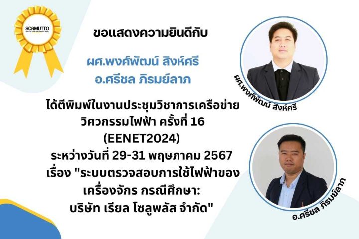 เรื่อง “ระบบตรวจสอบการใช้ไฟฟ้าของเครื่องจักร กรณีศึกษา : บริษัท เรียล โซลูพลัส จำกัด” ได้ตีพิมพ์ในงานประชุมวิชาการเครือข่ายวิศวกรรมไฟฟ้า ครั้งที่ 16 (EENET2024) ระหว่างวันที่ 29-31 พฤษภาคม 2567