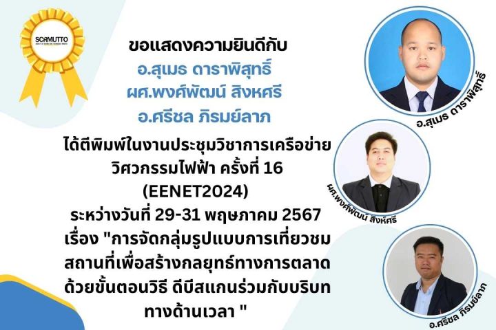 เรื่อง “การจัดกลุ่มรูปแบบการเที่ยวชมสถานที่เพื่อสร้างกลยุทธ์ทางการตลาดด้วยขั้นตอนวิธี ดีบีสแกนร่วมกับบริบททางด้านเวลา ” ได้ตีพิมพ์ในงานประชุมวิชาการเครือข่ายวิศวกรรมไฟฟ้า ครั้งที่ 16 (EENET2024) ระหว่างวันที่ 29-31 พฤษภาคม 2567