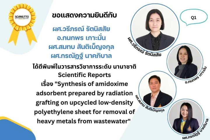 เรื่อง “Synthesis of amidoxime adsorbent prepared by radiation grafting on upcycled low-density polyethylene sheet for removal of heavy metals from wastewater” ได้ตีพิมพ์ในวารสารวิชาการระดับ นานาชาติ Scientific Report