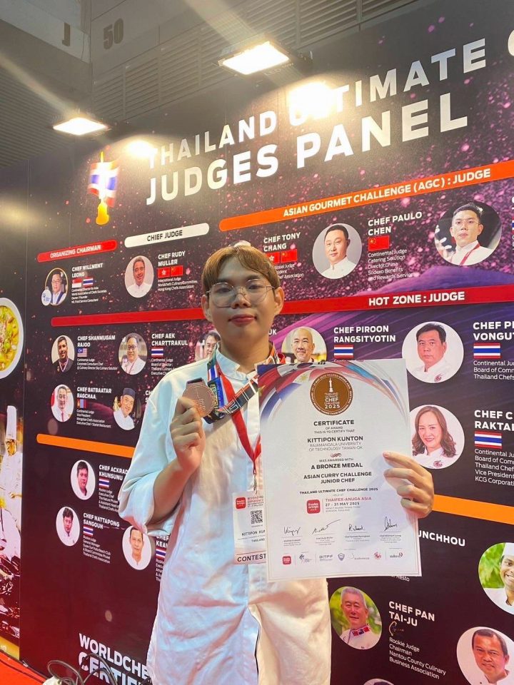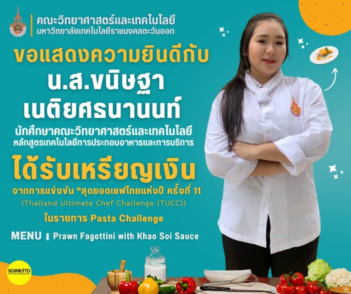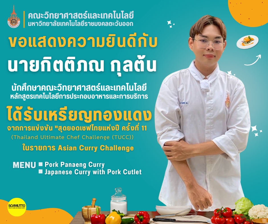 สาขาวิชาพัฒนาผลิตภัณฑ์อุตสาหกรรมเกษตร คณะวิทยาศาสตร์และเทคโนโลยี มทร.ตะวันออก ส่งนักศึกษาหลักสูตรเทคโนโลยีการประกอบอาหารและการบริการเข้าร่วมแข่งขัน 2 ราย โดยสามารถคว้ารางวัลจากเวทีระดับประเทศ ดังนี้