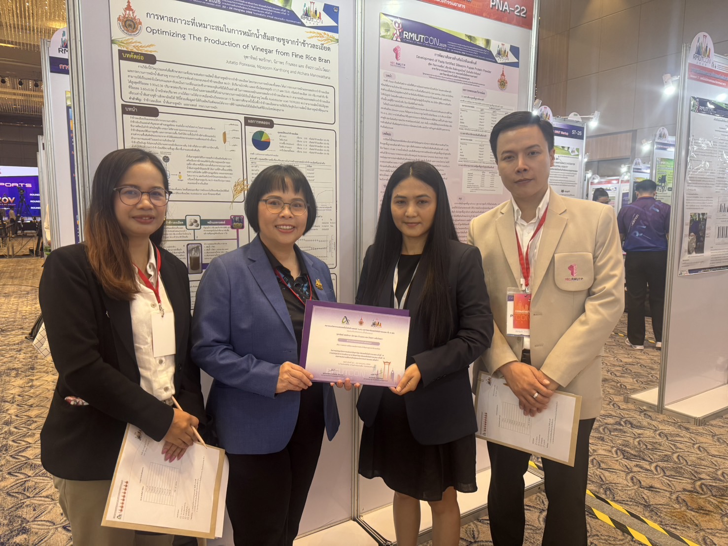 • นางสาวจุฑาทิพย์ พลรักษา และคณะ (นักศึกษาสาขาวิชาเทคโนโลยีชีวภาพเกษตร) เรื่อง “การหาสภาวะที่เหมาะสมในการหมักน้ำส้มสายชูจากรำข้าวละเอียด”