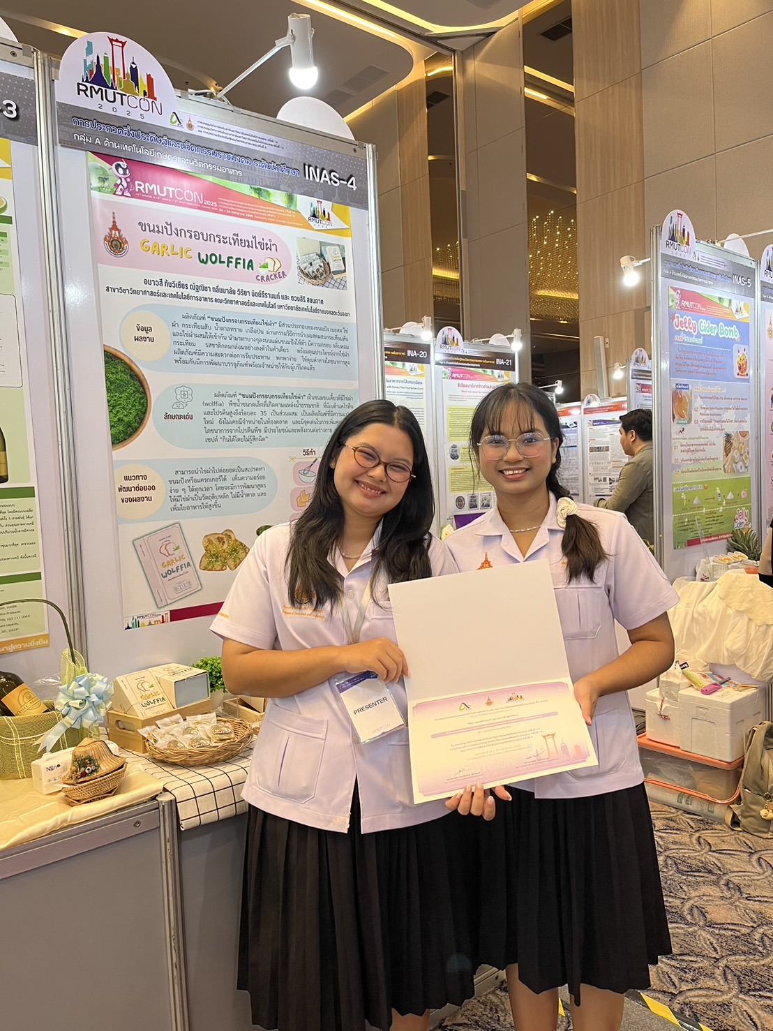 • นางสาวอมาวสี ทับวิเชียร และคณะ (นักศึกษาสาขาวิชาวิทยาศาสตร์และเทคโนโลยีการอาหาร) เรื่อง “ขนมปังกรอบกระเทียมไข่ผำ”