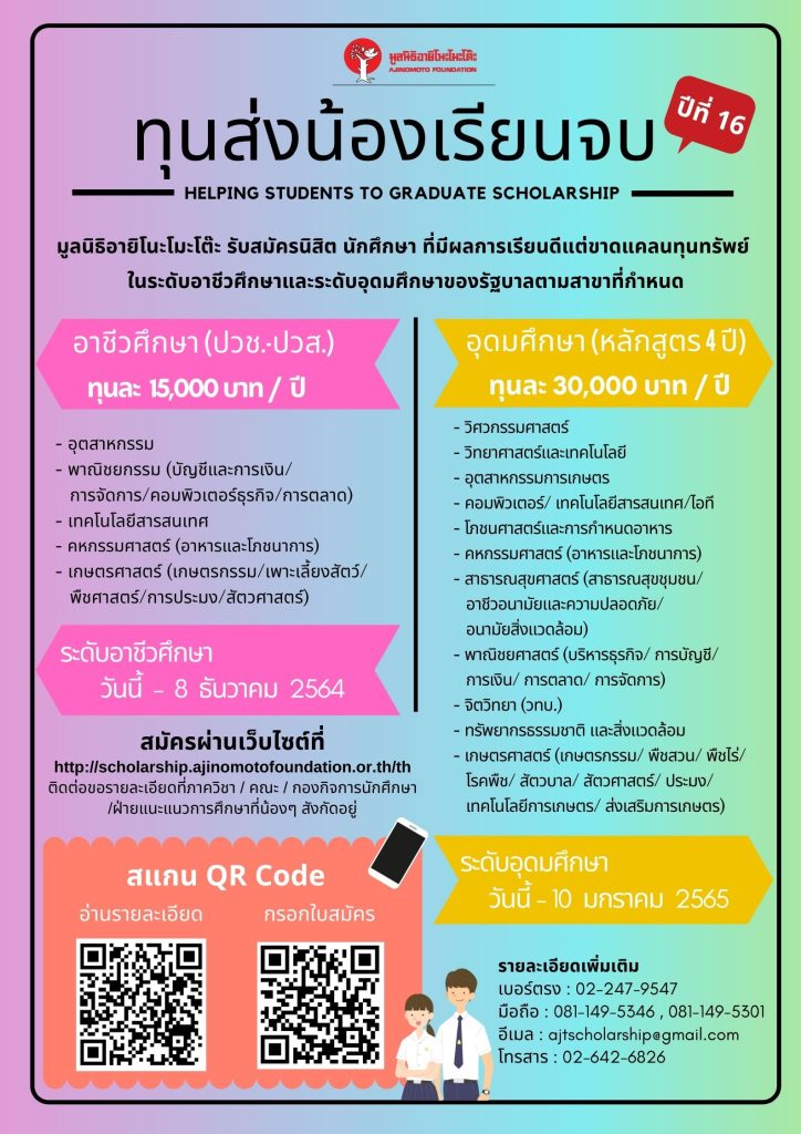 ประชาสัมพันธ์ทุนการศึกษาโครงการ “ทุนส่งน้องเรียนจบ” ระดับอุดมศึกษา ปี 2564 ของมูลนิธิอายิโน๊ะโม๊ะโต๊ะ